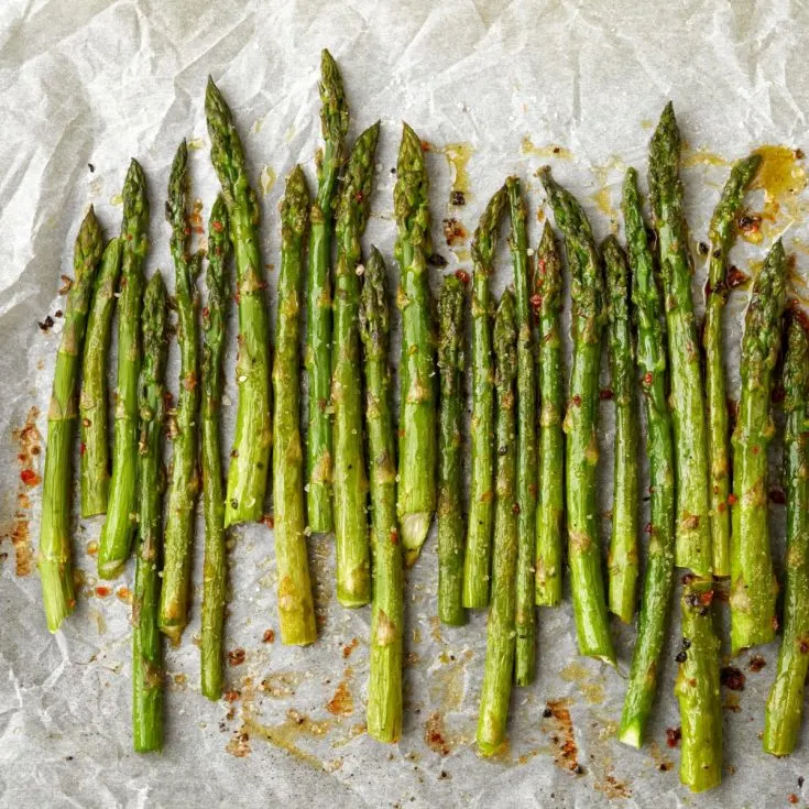 If you are growing asparagus at home, harvest spears when they are about the thickness of a pencil or slightly thicker. Fresh asparagus in the middle of summer roasts beautifully and often needs even less time in the oven.