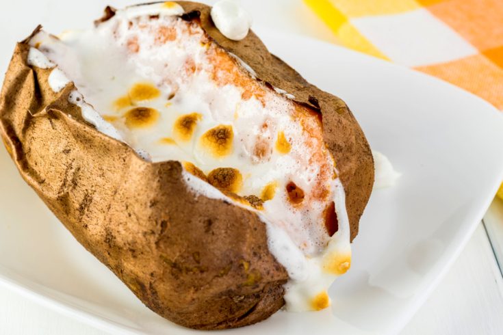 Preheat the oven to broil and leave the wire rack in the same position that you used to bake the sweet potatoes. Then place the baking pan with the loaded sweet potatoes back into the oven. Broil until the marshmallows just start to brown.
