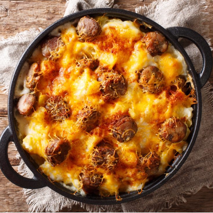 Smoked sausage adds rich, savory flavor to this dish without any extra seasoning needed. Since it’s fully cooked, all you have to do is slice it up and stir it in. It browns slightly while baking, giving the casserole a nice contrast to the creamy texture of the potatoes and cheese.